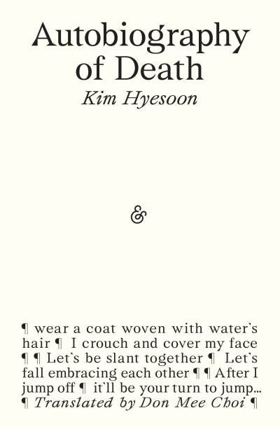 The title section of Kim Hyesoon's visceral Autobiography of Death consists of forty-nine poems, each poem representing a single day during which the spirit roams after death before it enters the cycle of reincarnation. The volume concludes on the other side of the mirror with 'Face of Rhythm', a poem about individual pain, illness, and meditation.