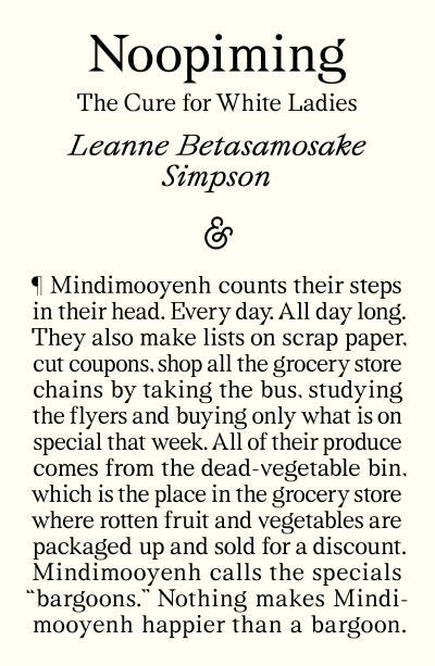 Join Simpson's quirky cast of seven as they upend colonial myth-making and expose the unnatural strangeness at the heart of settler-capitalism. With warm humour and canny observation, The Cure for White Ladies breaks open the self to a world still alive with people, animals, ancestors, and spirits.