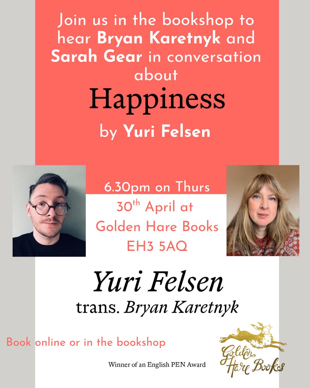 Happiness by Yuri Felsen Event with Bryan Karetnyk in conversation with Sarah Gear - Thursday 30th April 2026
